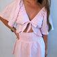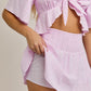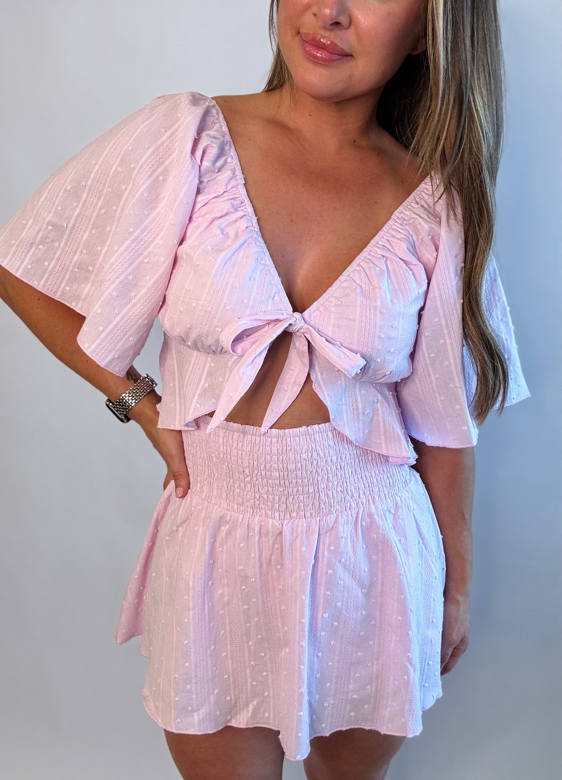 This Flared Tie Top Skirt Set features a fashionable tie closure top and a skirt with built-in shorts, perfect for a breezy and girly summer look.