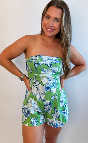 The Helen Green Romper features a strapless design, complete with a belted waist and a zip closure in the back. Its floral pattern adds a touch of elegance to the look.