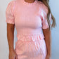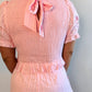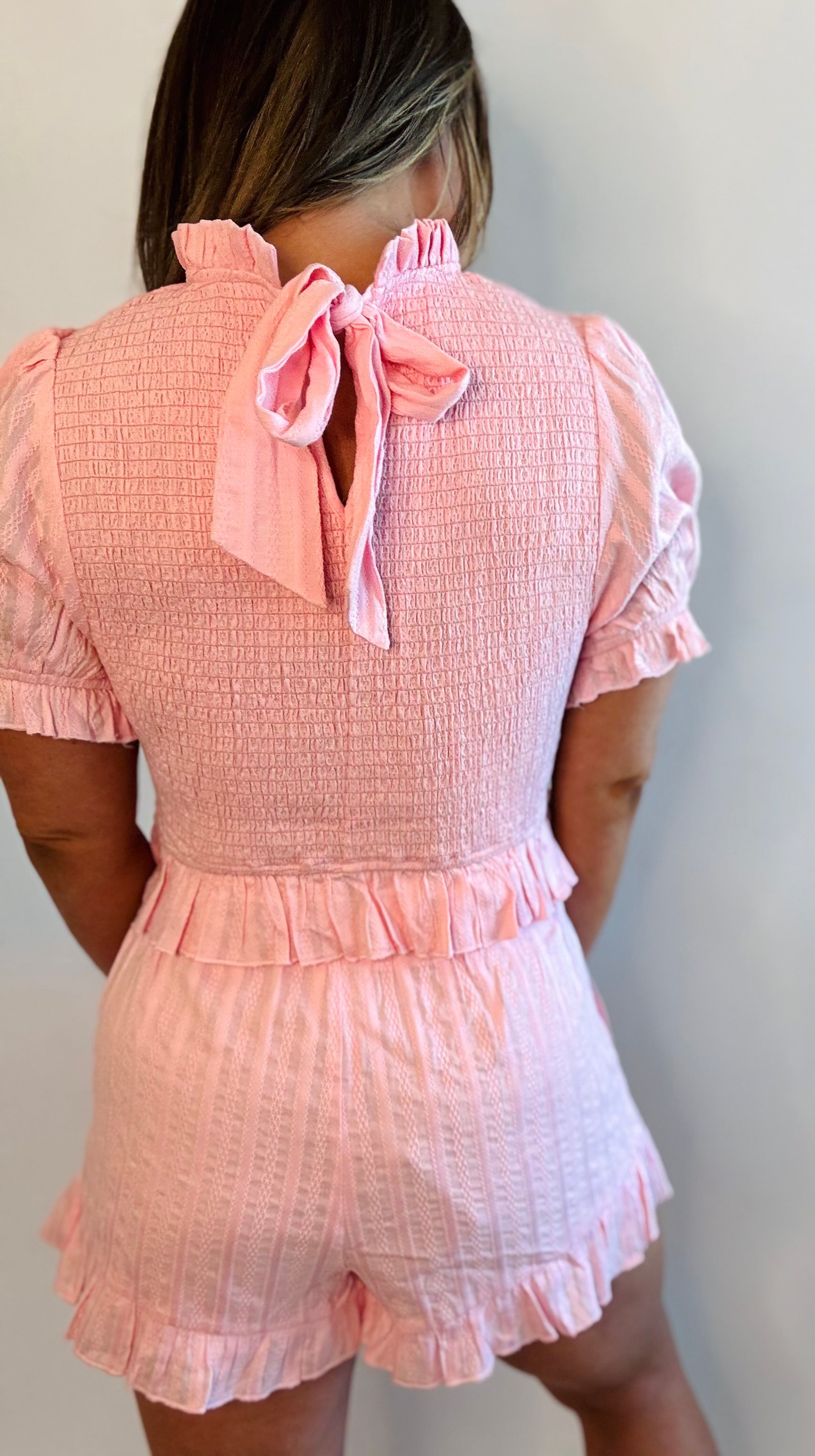 This short set features functional pockets and a bow neck tie, while also showcasing delicate and playful elements such as puff sleeve and ruffle trim details.