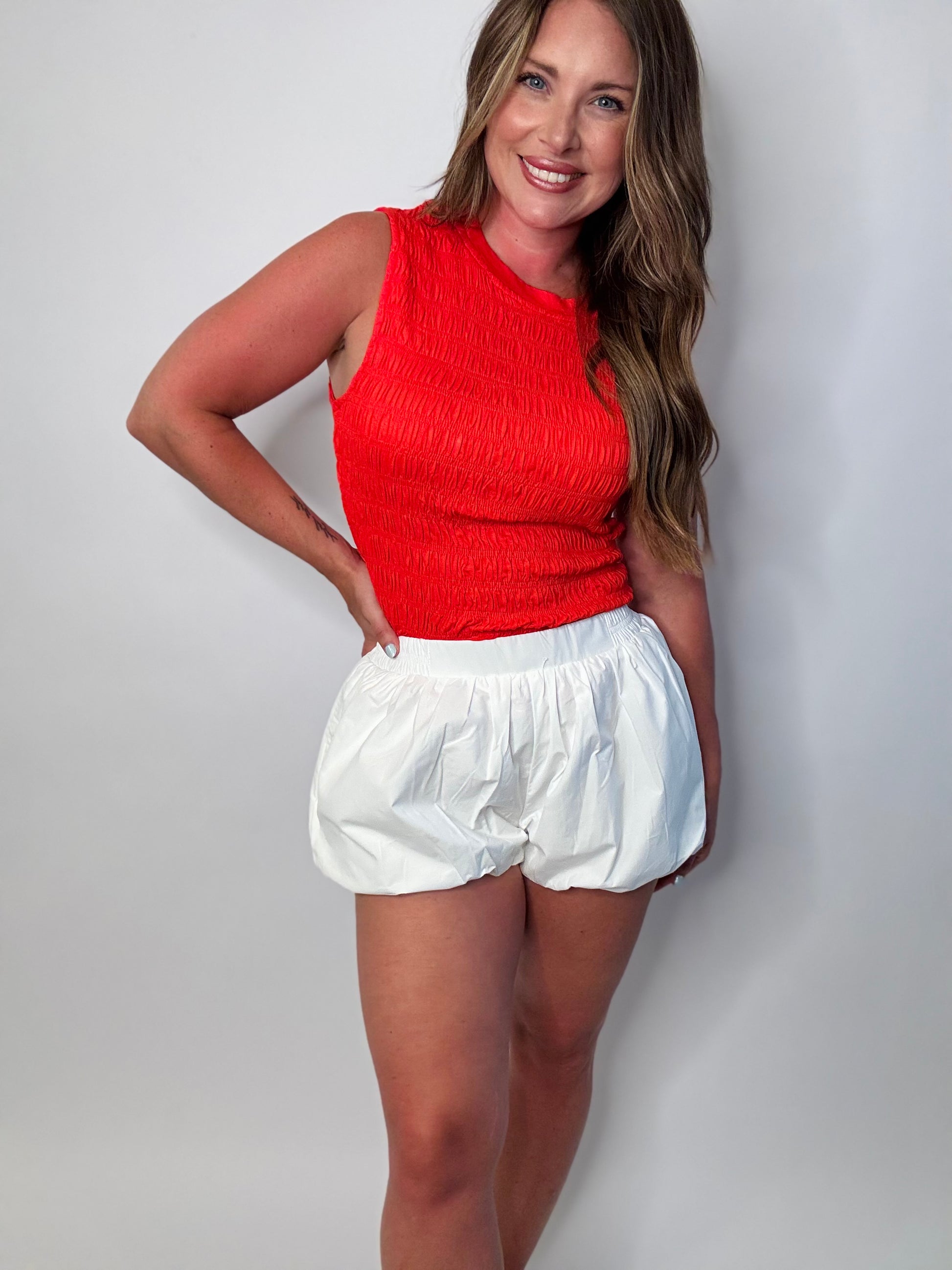 Crafted with smocked detailing and a ruffle hem, this stretchy knit tank top offers breathability and comfort for all-day wear.